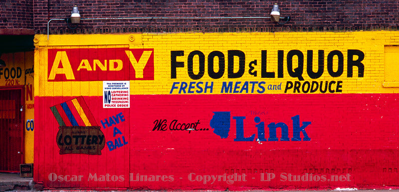 A and Y is an open-edition image. This is a small food and liquor store located near Garfield Park Conservatory, Chicago IL. Shortly after I captured the image this northern wall was repainted.Â