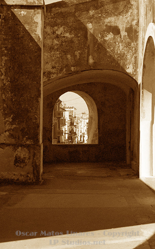 "A View of Nature" is a photograph capturing the west walls of Castillo San Cristobal in San Juan, Puerto Rico. The image showcases a window view from the castle, offering a perspective of the north side of Old San Juan.