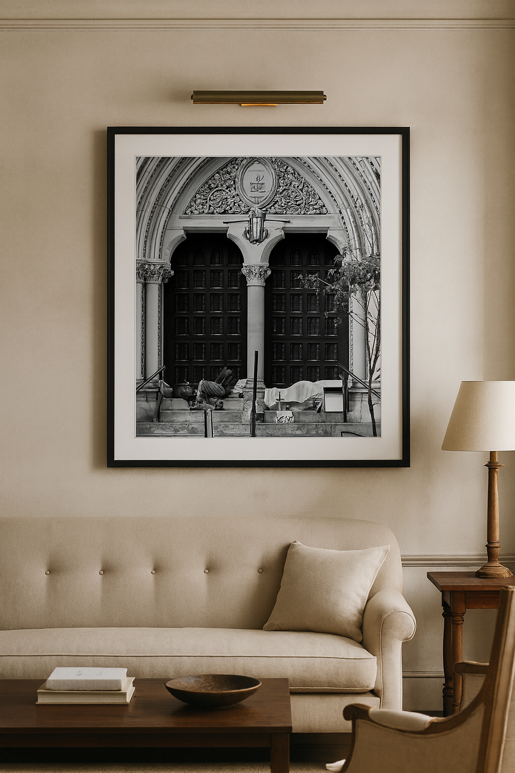In this fleeting instant, the photograph reveals both contrast and connection: the sacred and the forgotten, the sanctuary and the street.