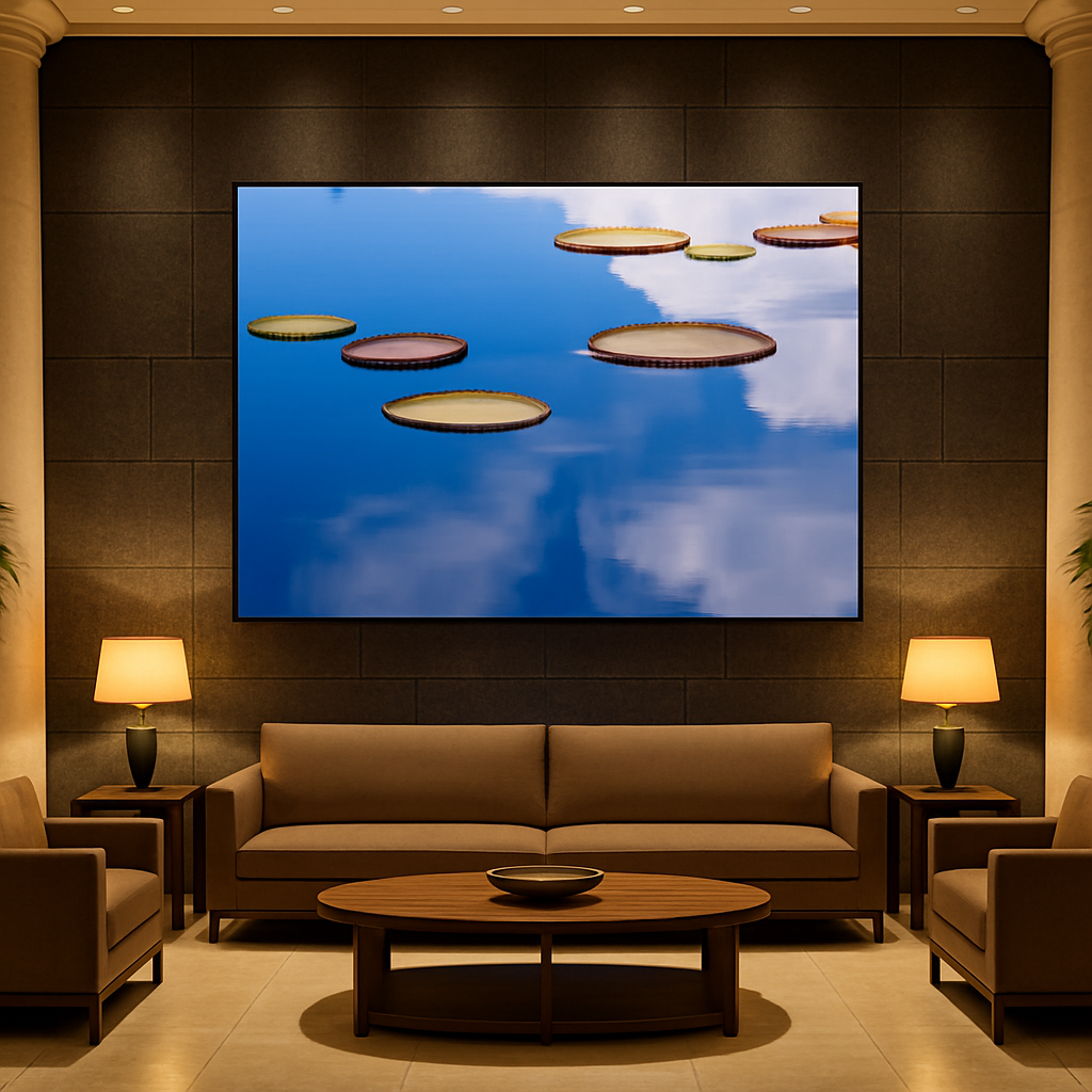 These are South American Water Lily Pads (Victoria cruziana) located at The Garfield Park Conservatory in Chicago during the 2015 summer. A been told when they are fully mature they can hold the weight of a human. The formation looks like pad stones that we use in the garden. This day there was a clear reflection of the blue sky creating the illusion that pads are created a path on the sky.