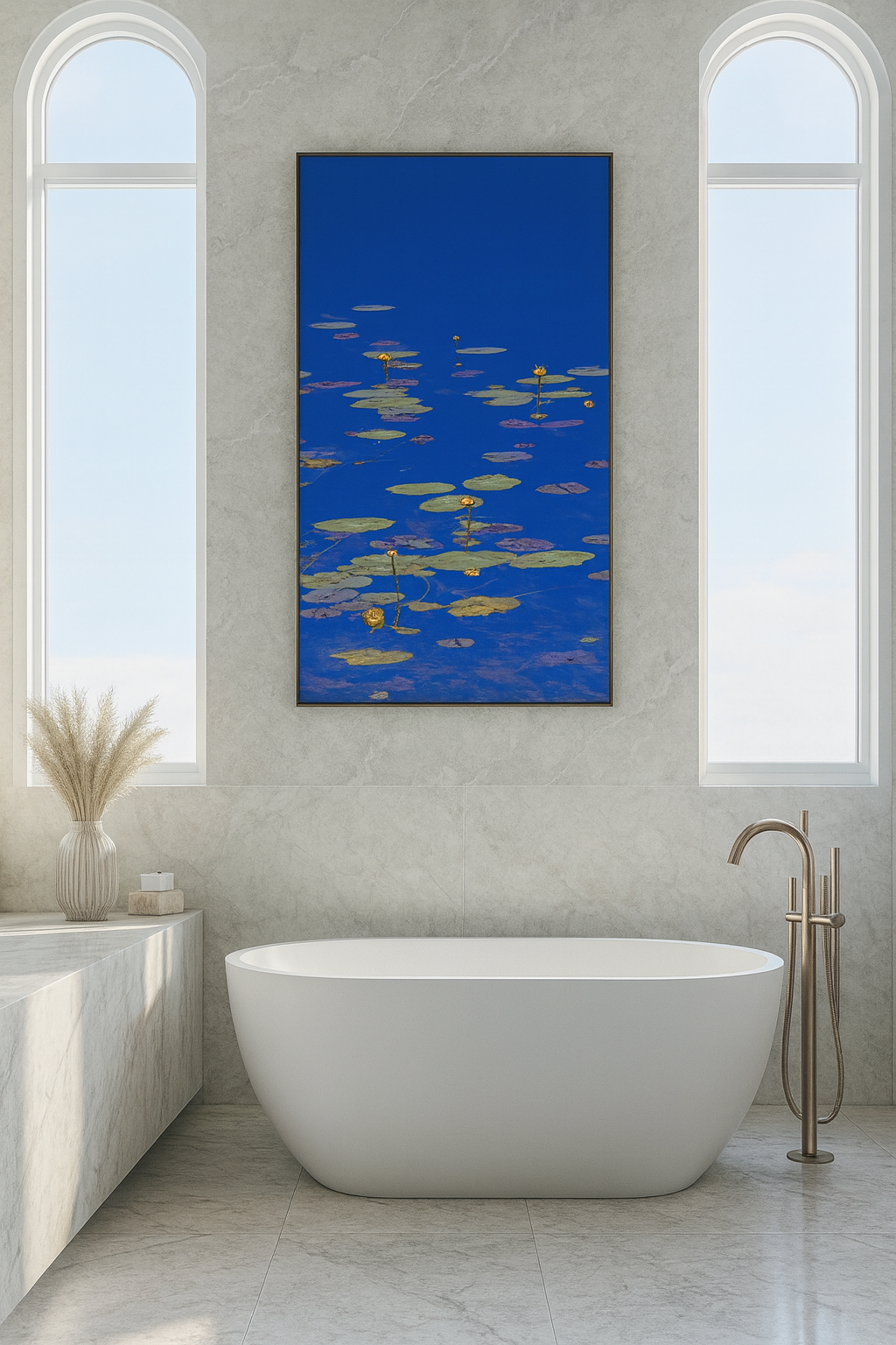 Starting Point is a limited edition of 250 images. Late in May 2014, I decided to visit the Chicago Botanic Garden before the Summer Art Fair Season started. While walking in the opposite area where The Carillon is located I noticed yellow dots over the lake. I walked closer to the edge of the lake and started taking pictures of the lake covered with a new yellow water lily. I started panning and I started noticing a blue cast but never gave another thought since most of the time you can not record that cast. To my surprise, 3 of 50 plus shots came with this intense blue cast and one of the three had great composition.